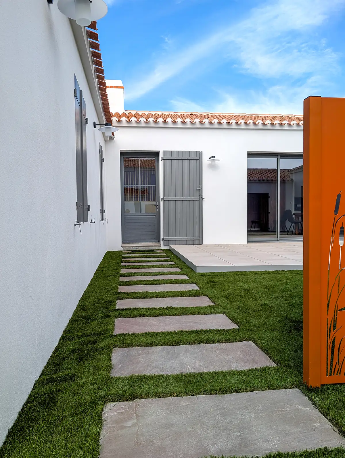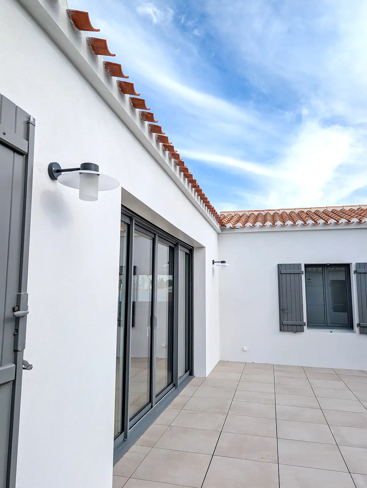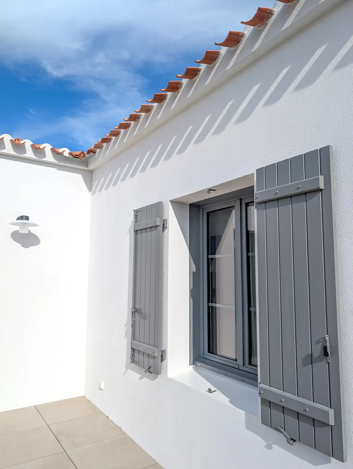Les choix esthétiques opérés renforcent l’intégration dans le paysage local. Les menuiseries bois Millet ainsi que les volets peints en gris RAL 7037 viennent souligner les lignes sobres et les proportions équilibrées de la maison, respectueuses du patrimoine vendéen.
