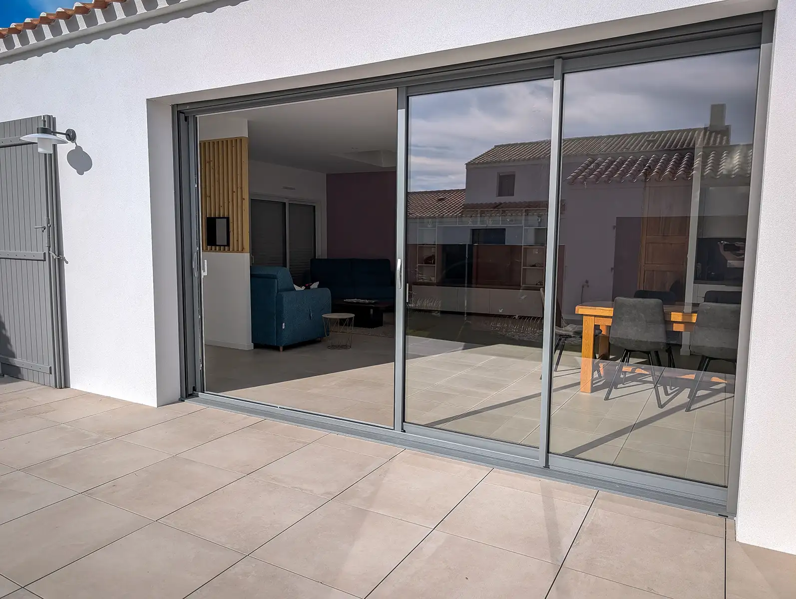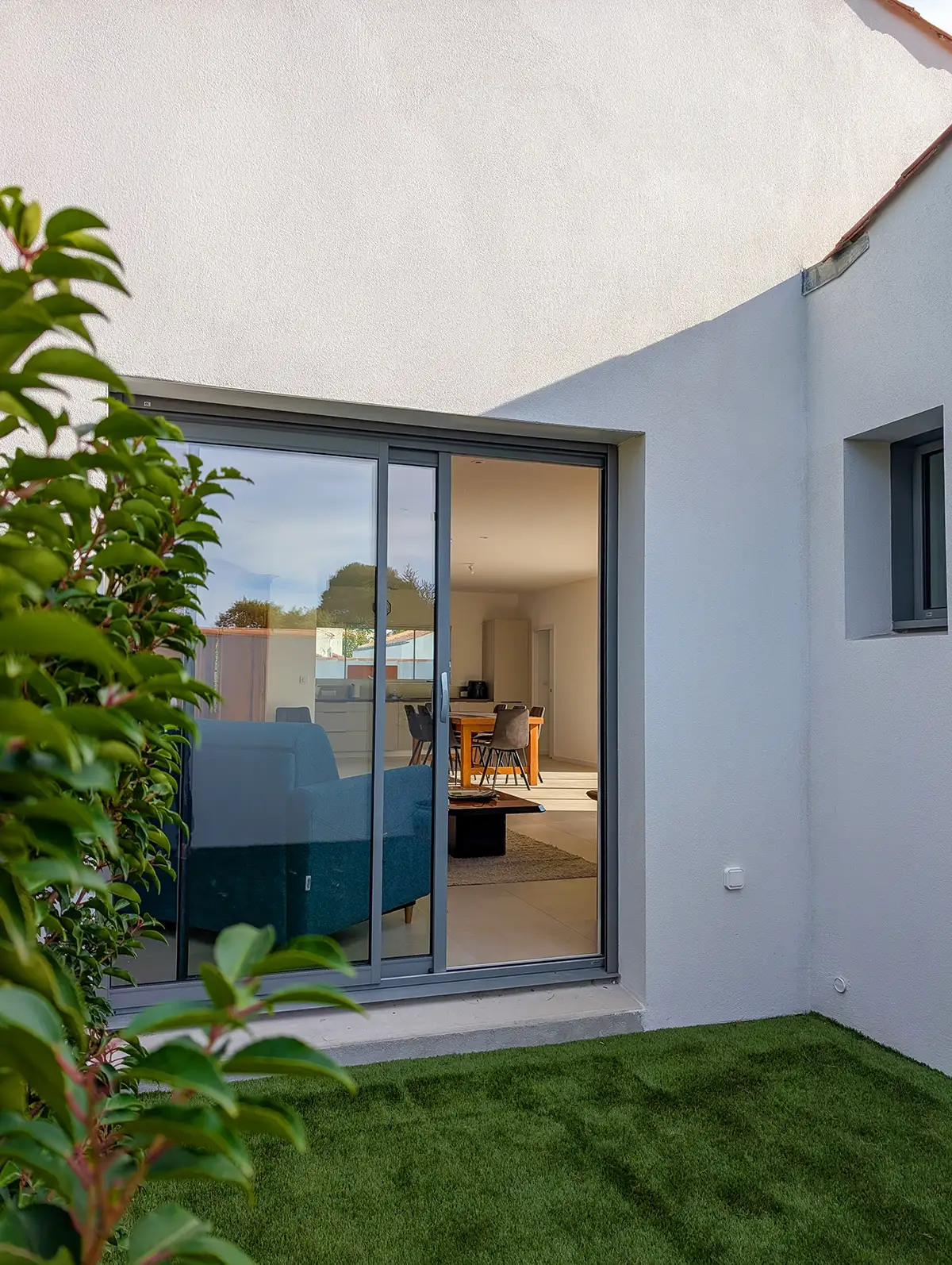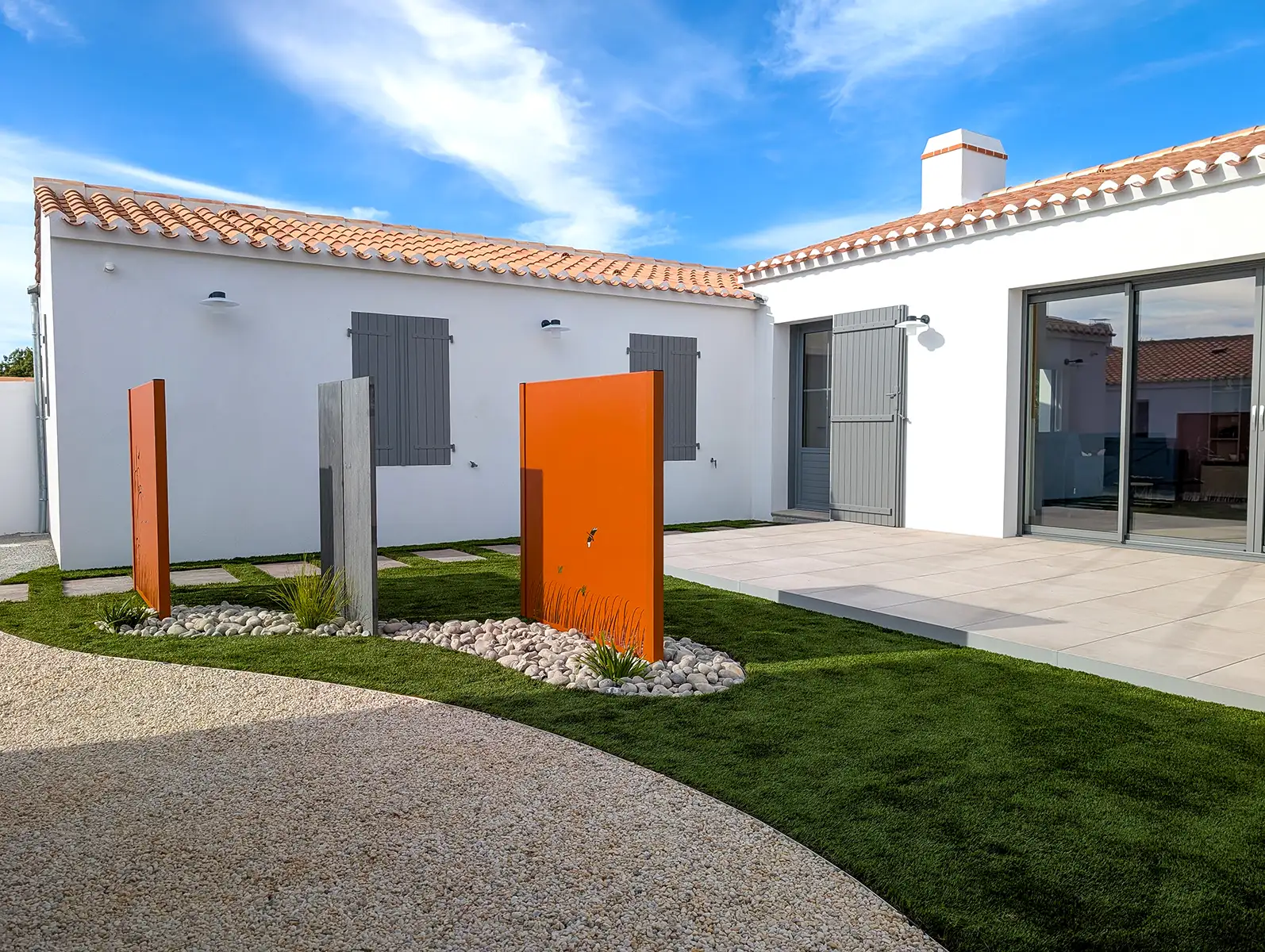 Les choix esthétiques opérés renforcent l’intégration dans le paysage local. Les menuiseries bois Millet ainsi que les volets peints en gris RAL 7037 viennent souligner les lignes sobres et les proportions équilibrées de la maison, respectueuses du patrimoine vendéen.