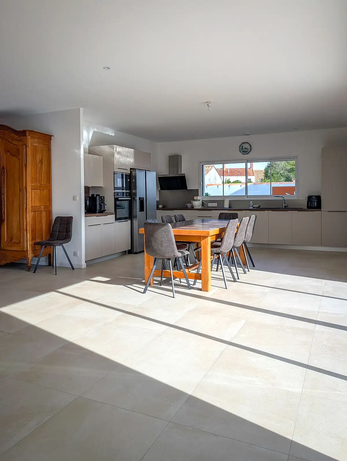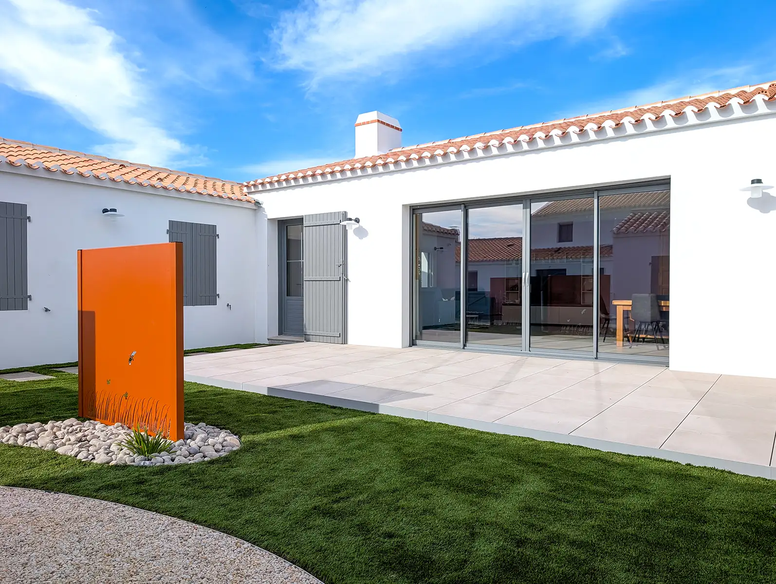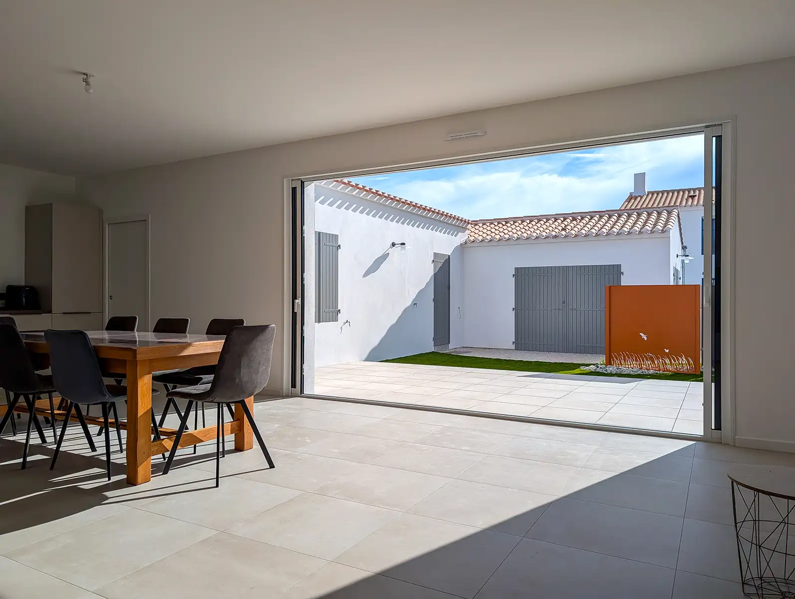 Dans cette maison, le caractère des espaces extérieurs vient répondre au confort des aménagements intérieurs. La pièce de vie, spacieuse et conviviale, profite d’une luminosité exceptionnelle grâce à un galandage de quatre mètres de large sur deux mètres trente-cinq de haut, offrant une ouverture totale sur la terrasse et le jardin. Cette conception permet de profiter pleinement de la lumière naturelle et du climat de Noirmoutier-en-l’Île tout en créant une continuité fluide entre l’intérieur et l’extérieur.