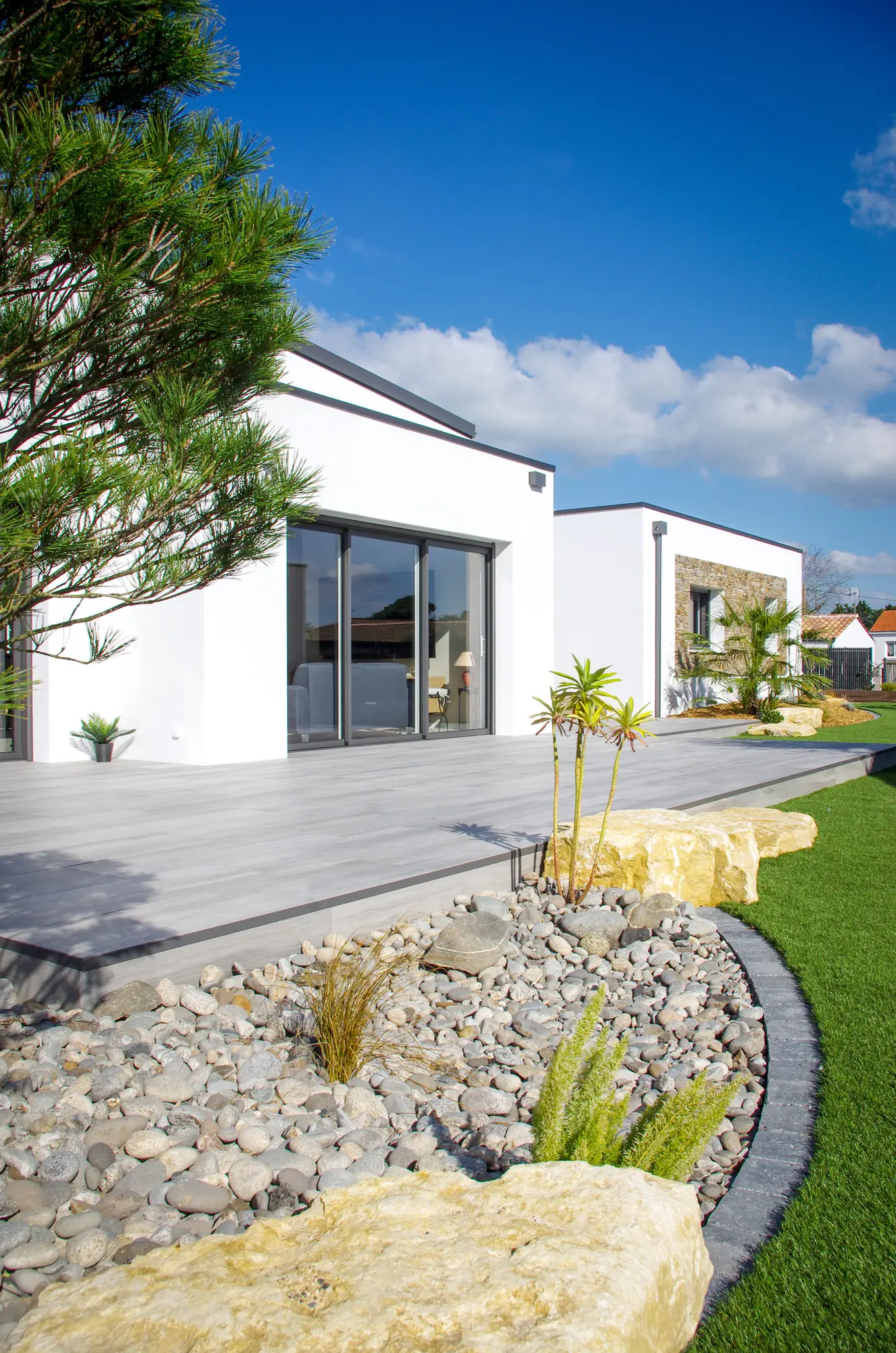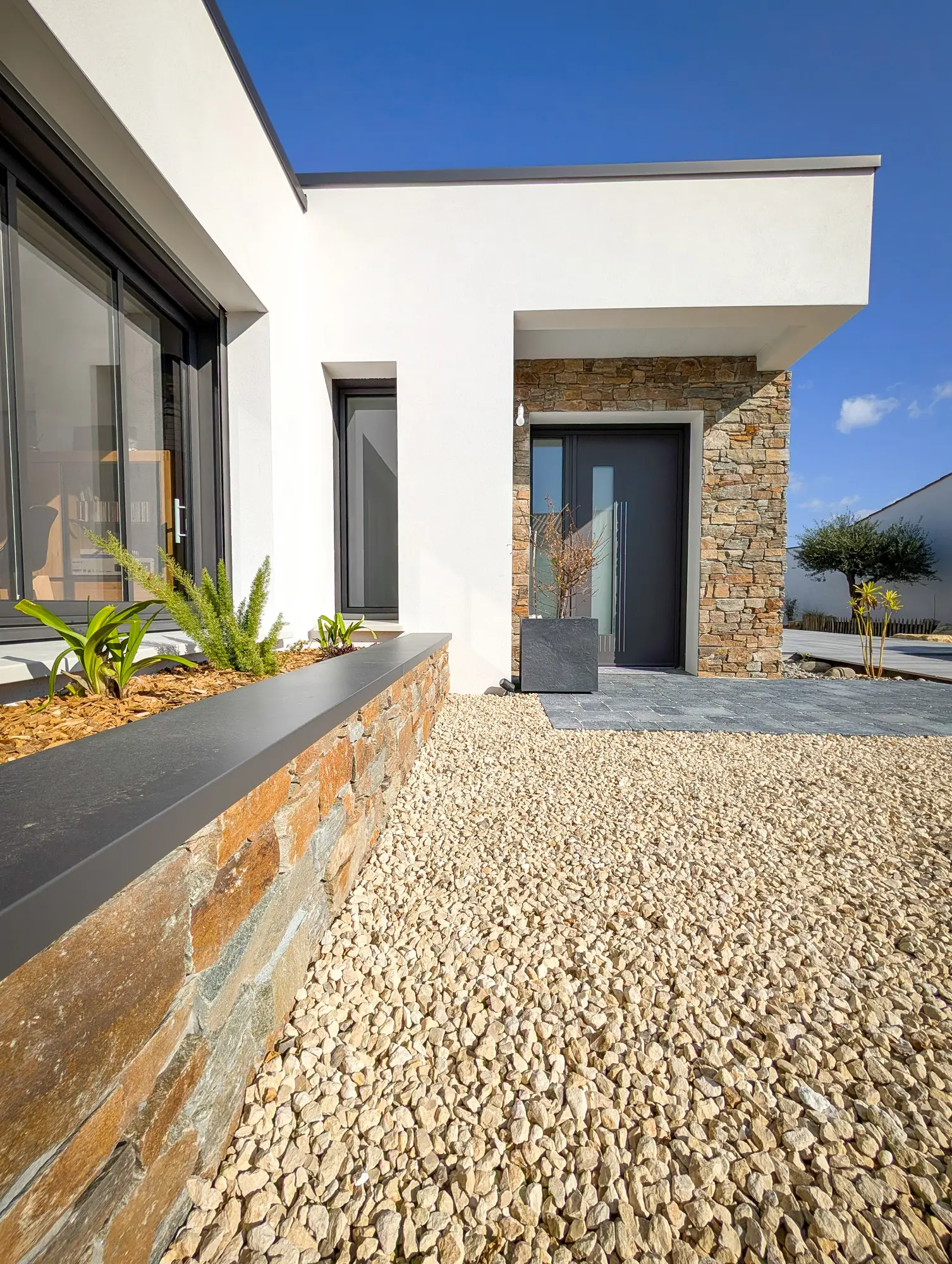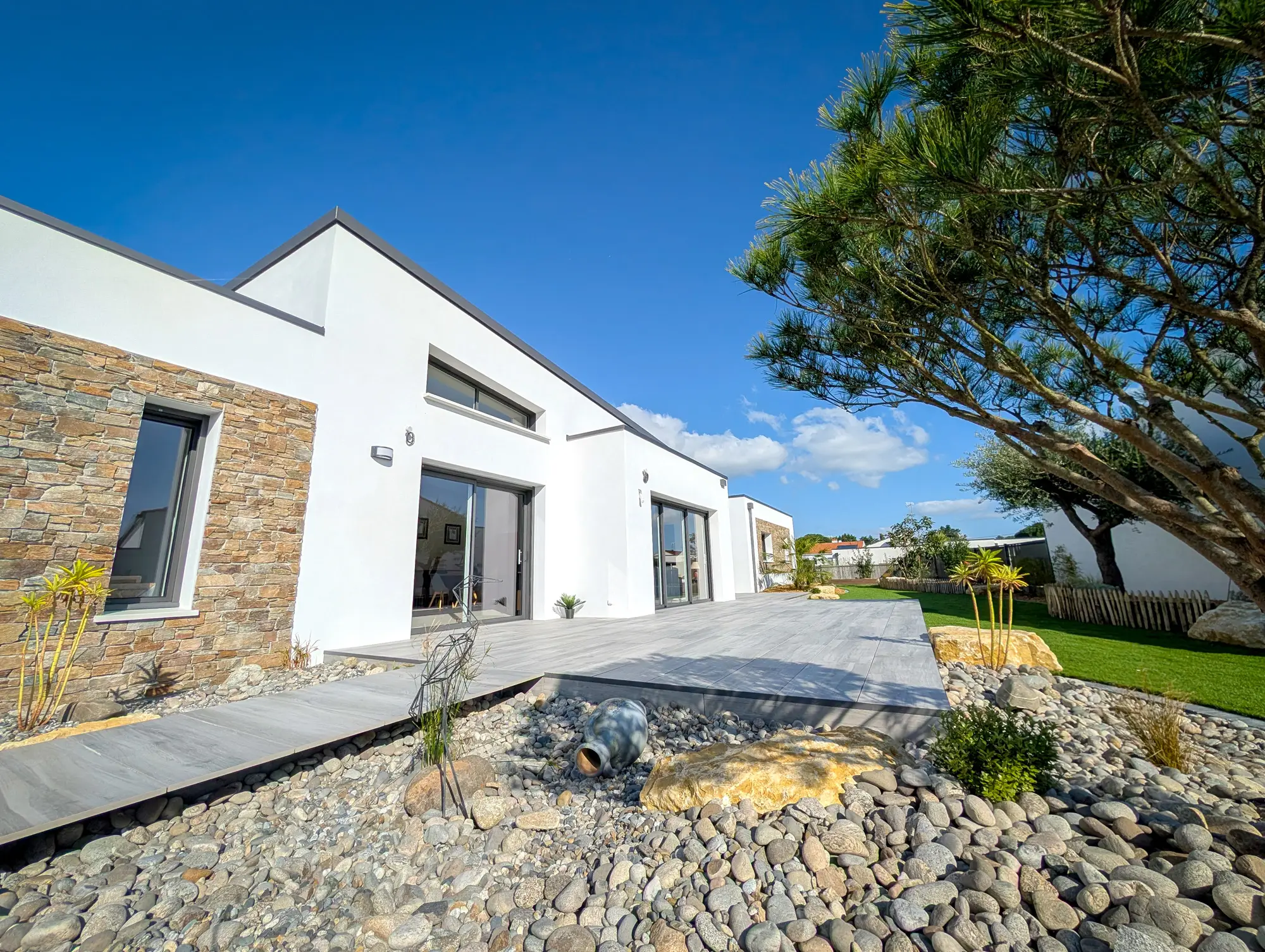 Les aménagements extérieurs ont été confiés à OSE Paysage, qui a su créer un cadre en harmonie avec l’architecture de la maison. Plantations, terrasse en carrelage sur plots, jardinières : chaque élément participe à l’ensemble et ancre la maison dans son environnement naturel avec évidence.