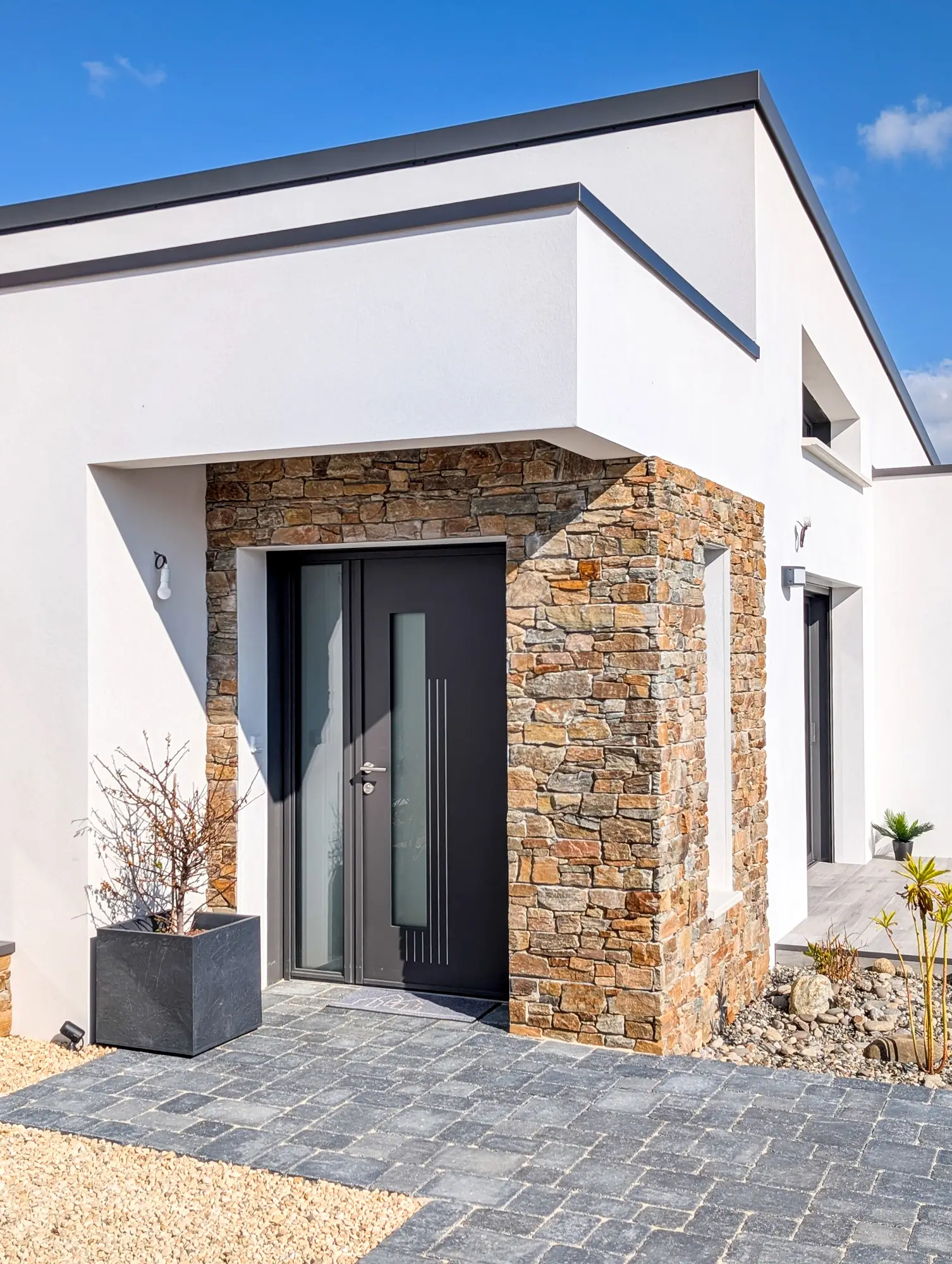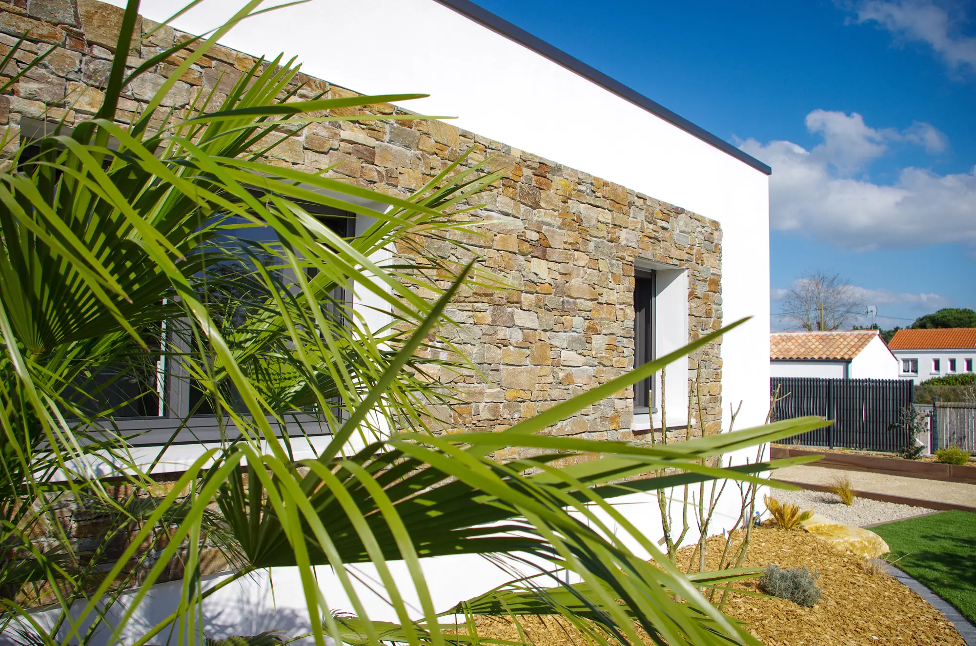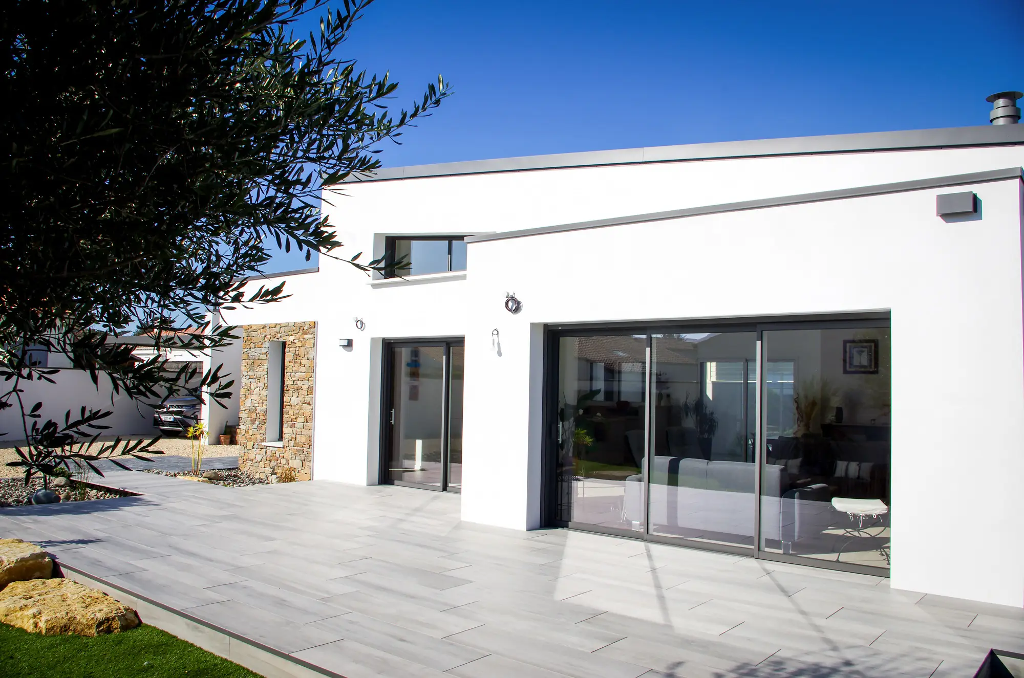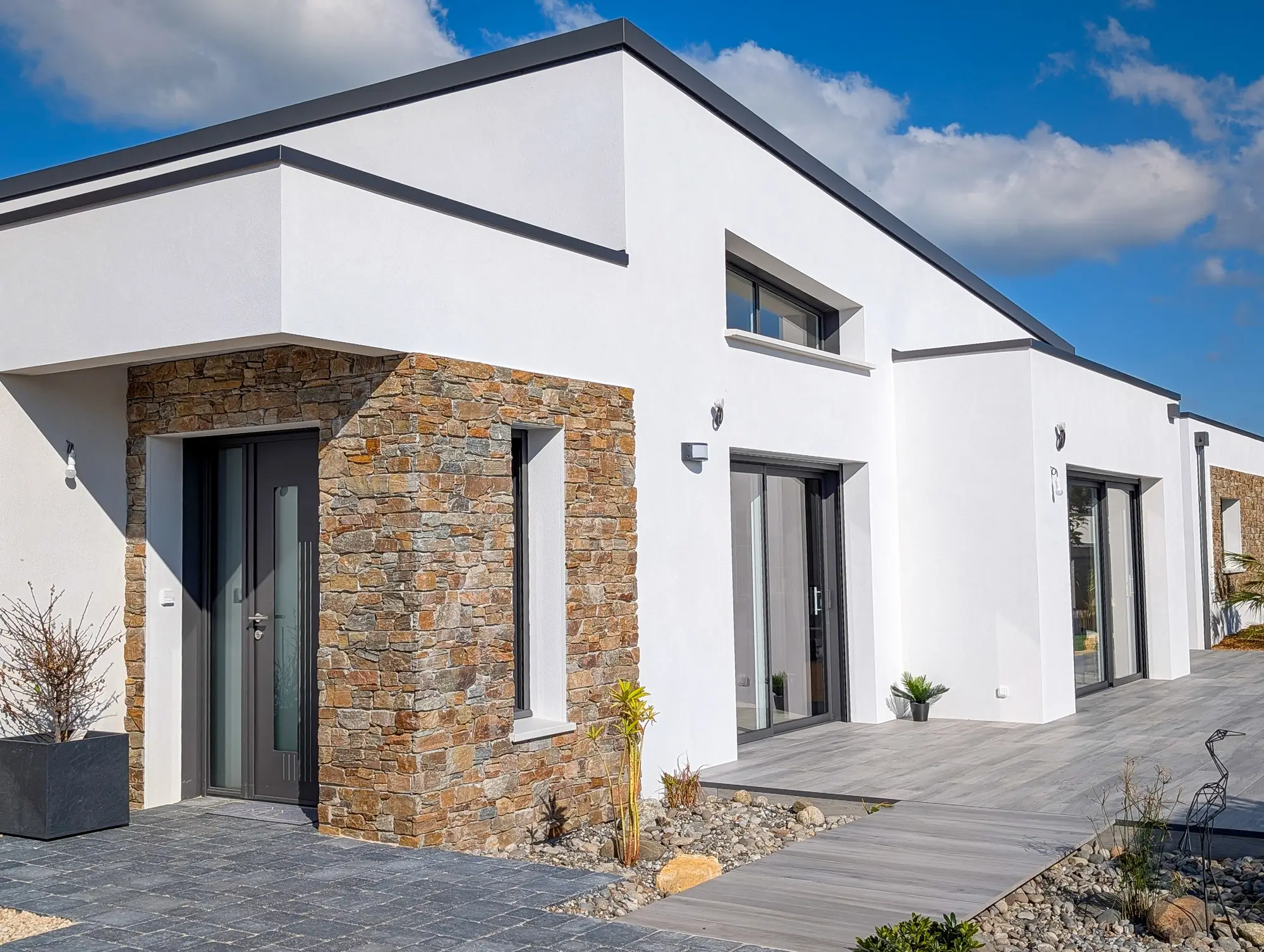 Les aménagements extérieurs ont été confiés à OSE Paysage, qui a su créer un cadre en harmonie avec l’architecture de la maison. Plantations, terrasse en carrelage sur plots, jardinières : chaque élément participe à l’ensemble et ancre la maison dans son environnement naturel avec évidence.