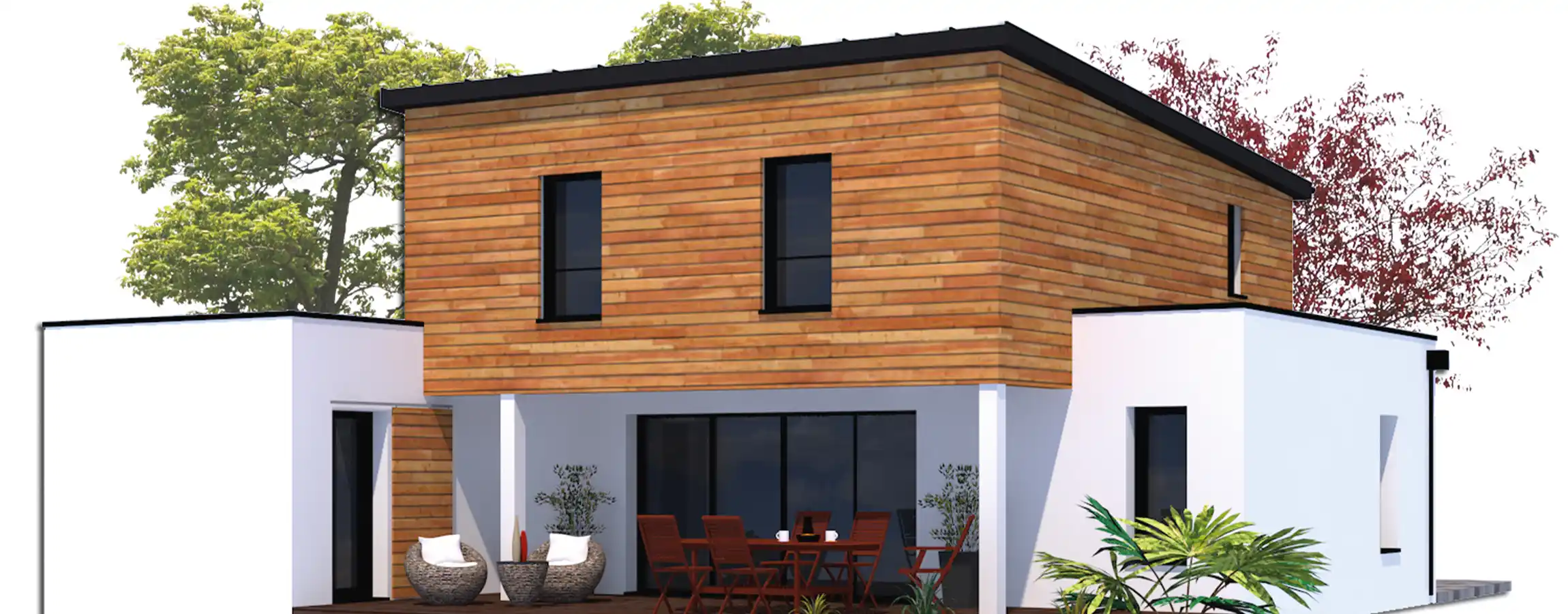 Grâce à son design compact, cette maison moderne à étage et à ossature bois a la particularité de pouvoir prendre place sur des parcelles peu larges. Son architecture extérieure mélange bardage bois, toiture plate et bac acier. La partie haute de la maison est traitée avec un bardage. Conçue pour les grandes familles, sa superficie est de 120 m² habitables et elle compte au total quatre chambres.