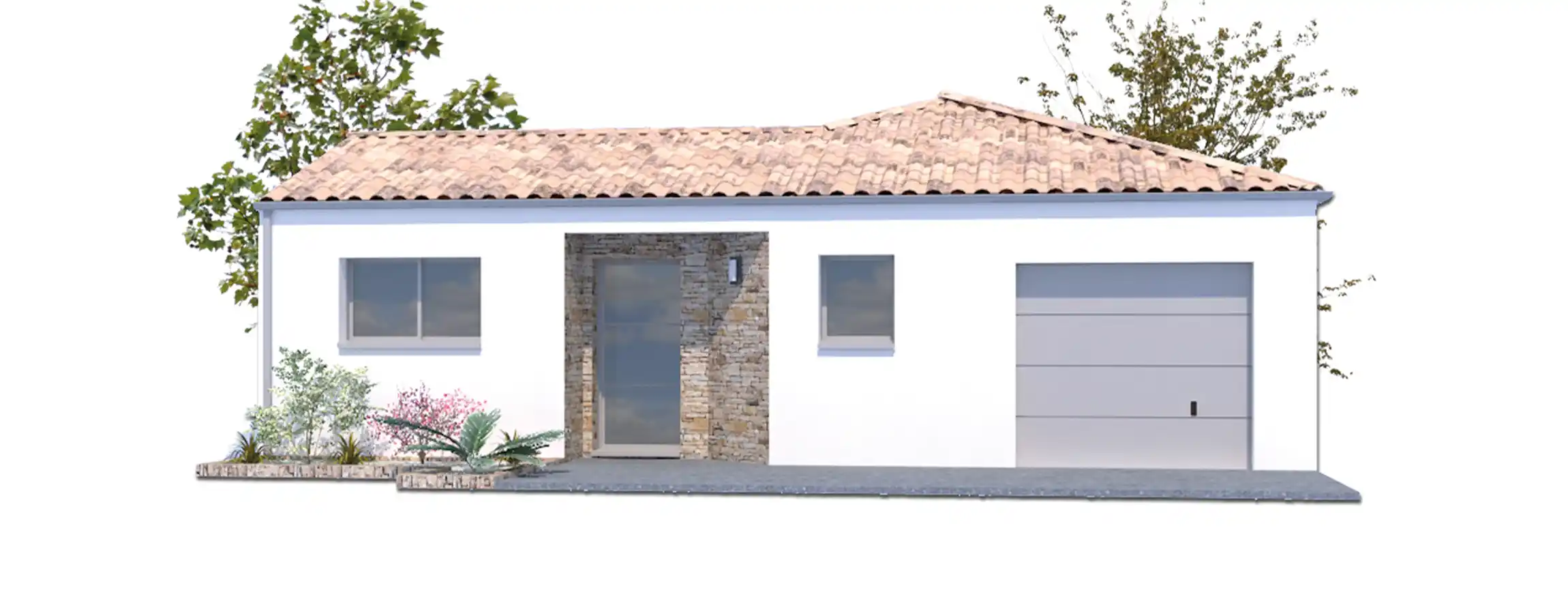 L’accès se fait par une porte d’entrée positionnée en renfoncement qui peut être valorisé avec un effet bois ou avec un enduit. La disposition des espaces permet de dissocier salon et cuisine américaine / salle à manger. Que ce projet soit interprété en 2 ou 3 chambres, la pièce de vie reste identique (près de 40 m²). Les ajustements sont effectués du côté de l’espace nuit.