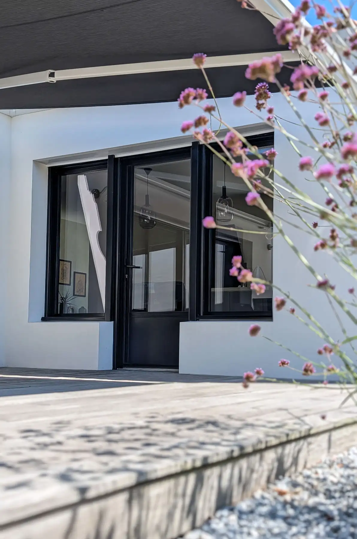 Les menuiseries noires apportent une touche d’élégance et de caractère à la façade, soulignant les lignes sobres et raffinées de la construction. Le double garage, pratique et spacieux, s’intègre avec finesse à l’ensemble. Le jardin, quant à lui, a été sublimé par les mains expertes de l’entreprise Rokaï à Saint-Gilles-Croix-de-Vie, qui a conçu un aménagement paysager aussi accueillant que charmant.